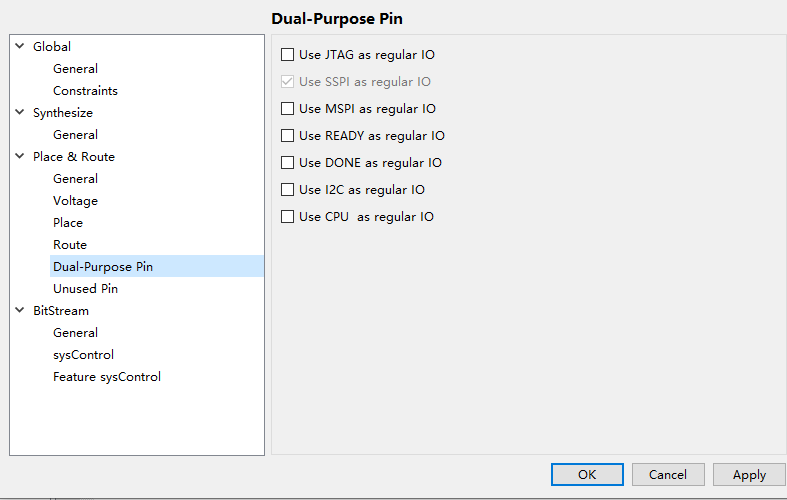 - 左侧选择 Place & Route → Dual-Purpose Pin